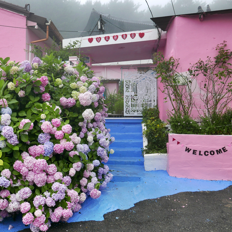 일주일 전에 다녀온 태종대 영도 분홍집. 흐린 날씨라서 굉장히 아쉬웠지만 수국을 보기 위해서 부산으로 향했는데 마침 사진을 찍을 때는 비가 내리지 않다가 사진을 다 찍으니까 엄청나게 쏟아졌다. 태종대 종점에서 버스 하차 후 도로를 반대편으로 건너서 태종대짬뽕을 지나 블루마운틴 사이 골목으로 계속 걸어간다. 여기가 진짜 맞나...? 싶을 때 마린리서치 건물이 나오고 그 사이 골목으로 활짝 핀 수국이 보인다.